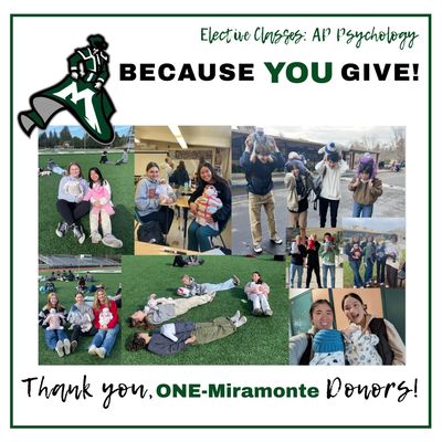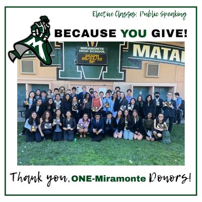 Each month in the Matador News, we include a special feature called "Because You Give", where we shine a spotlight on the programs, services, and activities that receive vital support from your generous donations to ONE-Miramonte. Take a look below at some of the previously featured stories for a glimpse of the impact your contributions have made. These are just a few programs that make up the enhanced educational experience our school can offer because of donations to ONE-Miramonte. Explore the comprehensive list of initiatives and services funded by your generous donations here. Thank you, ONE-Miramonte Donors! The Parents' Club is so grateful for your support!