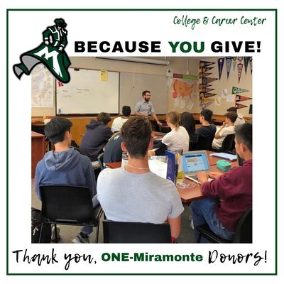 Because you give to ONE-Miramonte, our students get first-rate support planning for life after high school. The College & Career Center supports every student every day and is only able to do so thanks to ONE-Miramonte donors.
