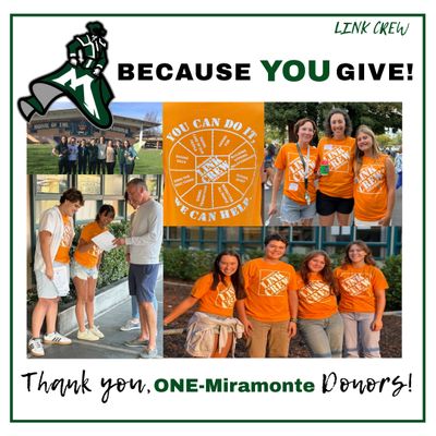 Because you give to ONE-Miramonte, you help support important clubs and organizations that allow students to learn leadership skills, explore their interests, and, in the case of Link Crew especially, build community at Miramonte. Being part of an organization such as Link Crew makes for a more meaningful and engaging high school experience, both for Link Crew members and the students they support. Donations help make student clubs and organizations possible at Miramonte.