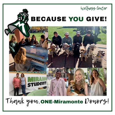The Wellness Center provides valuable support to all Miramonte students. The Wellness staff, led by Wellness Coordinator Mr. Sal Avila, provides our students with a wide range of services. Students can come in for short cool-down breaks, or those who are experiencing more persistent mental health struggles can have short-term, weekly counseling sessions with one of the staff. The Wellness Center also provides education to all students about healthy relationships and boundaries, managing stress, and mindfulness. And the therapy dogs that visit during various times of the year are always a big hit with the students!