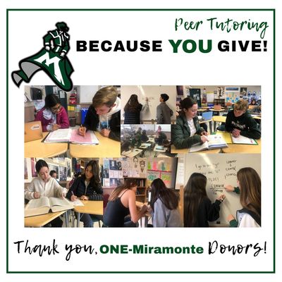Because you give to ONE-Miramonte, students are able to get extra support to understand course material they’re struggling with, go over problems they missed on a test, review verb conjugations they’re not quite getting, or get help clarifying their thesis for an essay. When our students get the support they need, they can gain confidence and achieve their potential. Peer tutoring is a valuable program at MHS both for supporting student learning and promoting community and connection. Thank you, ONE-Miramonte donors!
