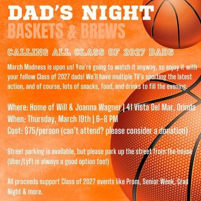 March Madness is upon us! You’re going to watch it anyway, so enjoy it with your fellow Class of 2027 dads! We’ll have multiple TV’s sporting the latest action, and of course, lots of snacks, food, and drinks to fill the evening.